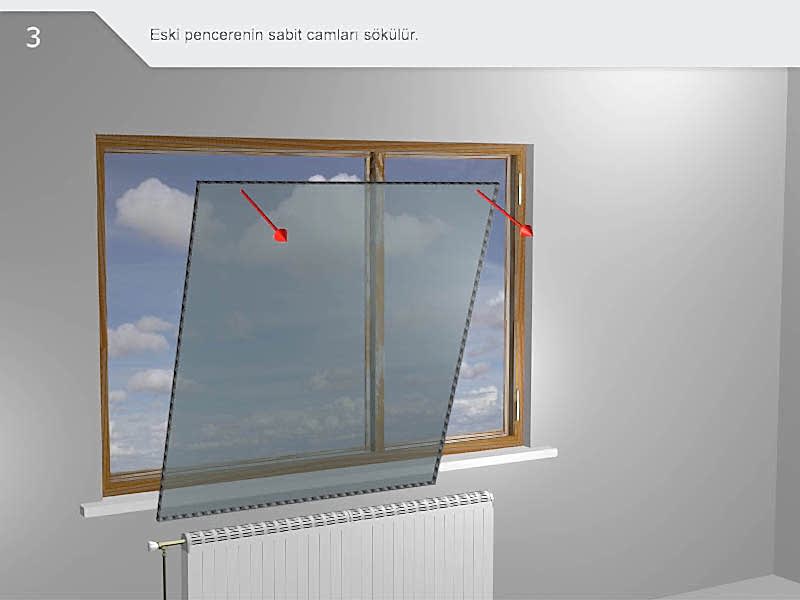 Eski pencerenin kanatları menteşelerinden çıkartılır.