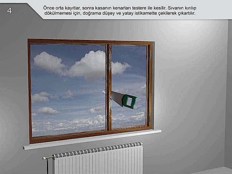 Önce orta kayıtlar, sonra kasanın kenarları testere ile kesilir. Sıvanın kırılıp dökülmemesi için, doğrama düşey ve yatay istikamette çekilerek çıkartılır.
