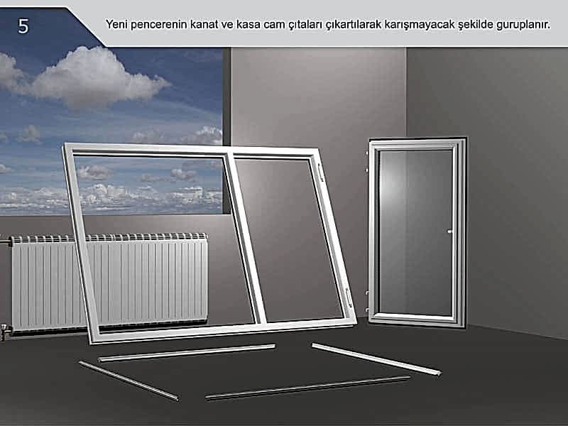 Yeni pencerenin kanar ve kasa cam çıtaları çıkartılarak karışmayacak şekilde gruplanır.