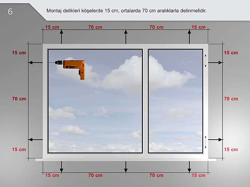 Montaj delikleri köşelerde 15 cm, ortalarda 70 cm aralıklarla delinmelidir.