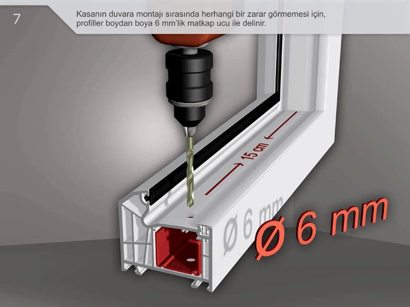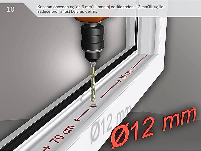 Kasanın önceden açılan 6 mm'lik montaj deliklerinden, 12 mm'lik uç ile sadece profilin üst bölümü delinir.
