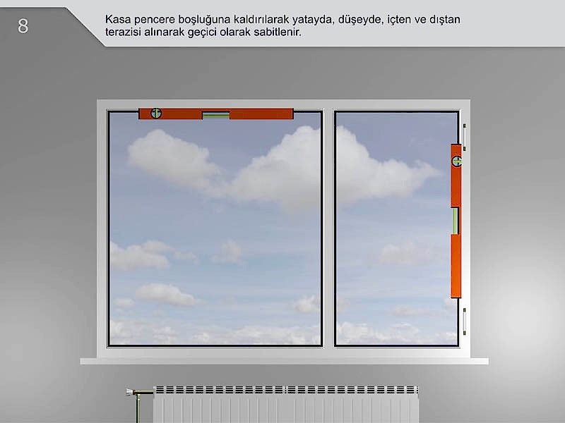 Kasa pencere boşluğuna kaldırılarak yatayda, düşeyde, içten ve dıştan terazisi alınarak geçici olarak sabitlenir.