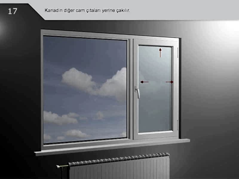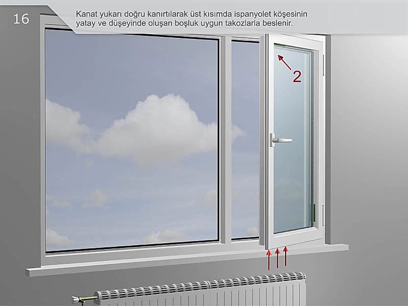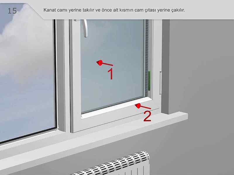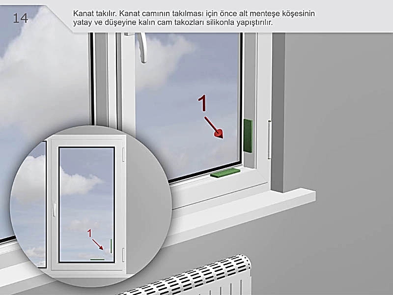 Kanat takılır. Kanat camının takılması için önce alt menteşe köşesinin yatay ve düşeyine kalın cam takozları silikonla yapıştırılır.